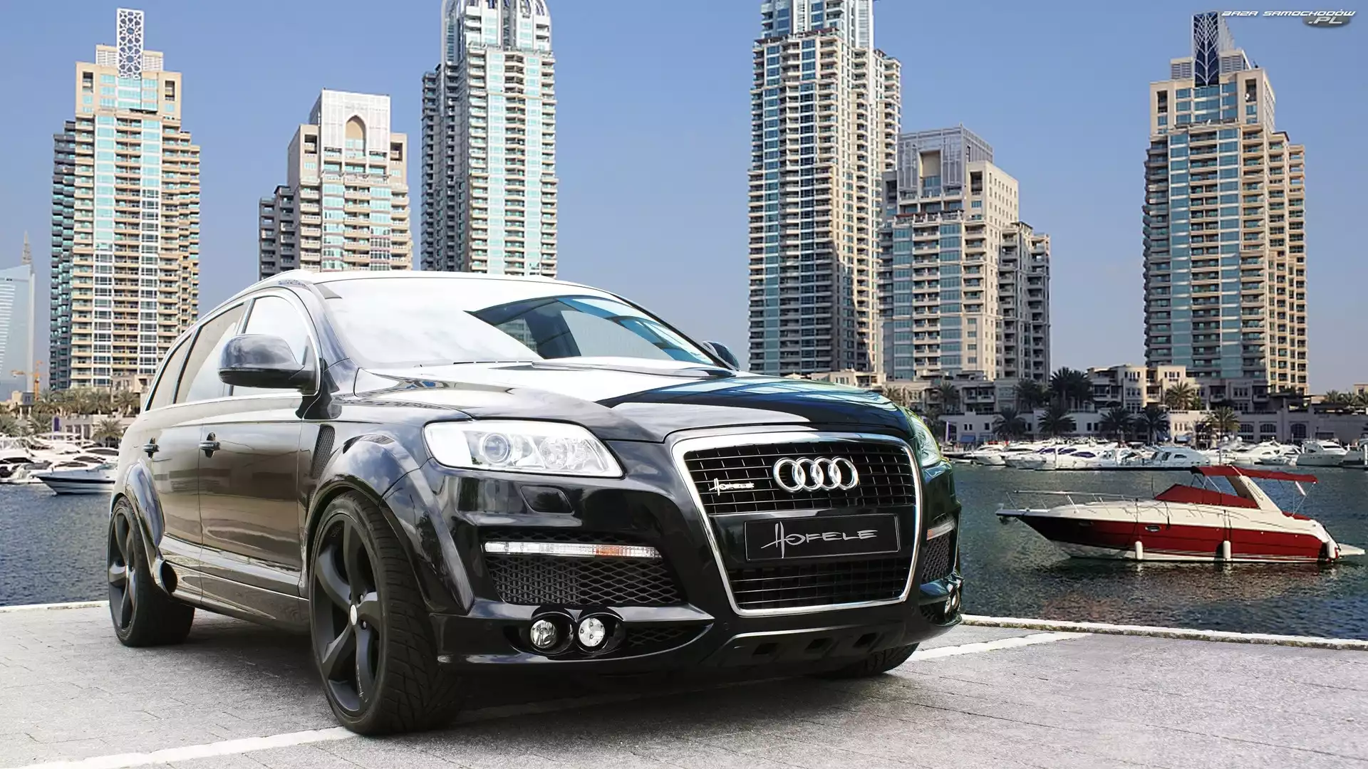 Łódka, Rzeka, Wieżowce, Audi Q7, Miasto- Zdjęcia samochodów