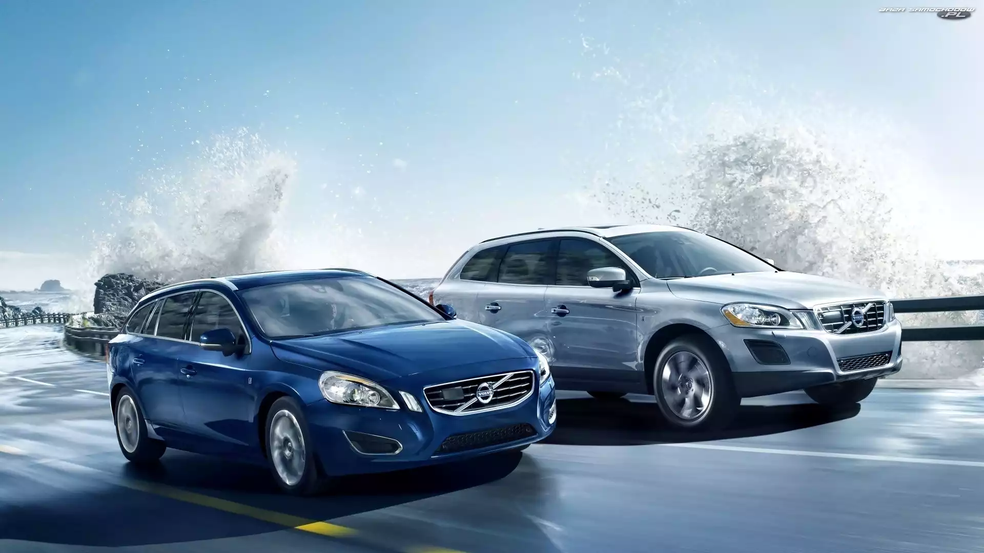 Volvo, Dwa, Droga, Woda, Samochody, Rozbryzgująca- Zdjęcia samochodów